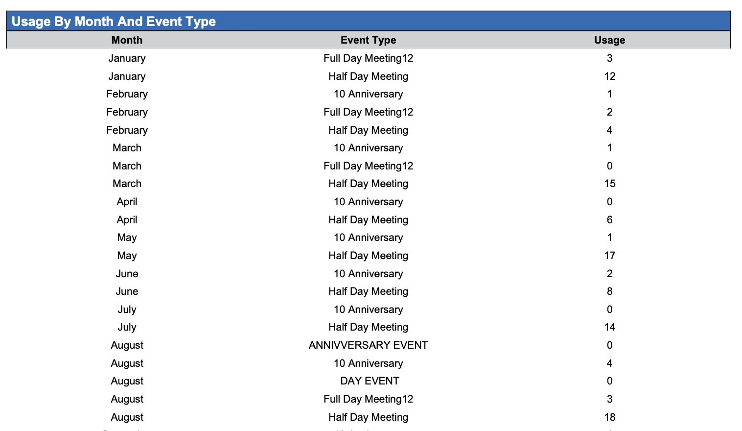 Event Space Occupancy Report - Usage by Month and Event Type Section