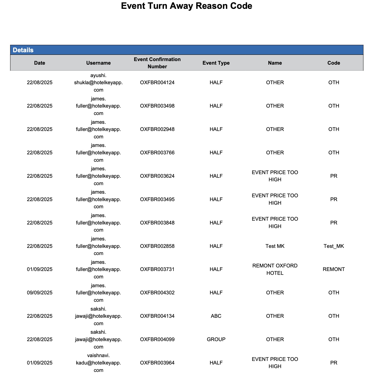 The Event Turn Away Reason Report is designed to help users understand why potential event business was not secured. This report tracks and categorizes all turned-away event inquiries or leads, providing insight into the specific reasons why a booking was declined, lost, or not pursued.