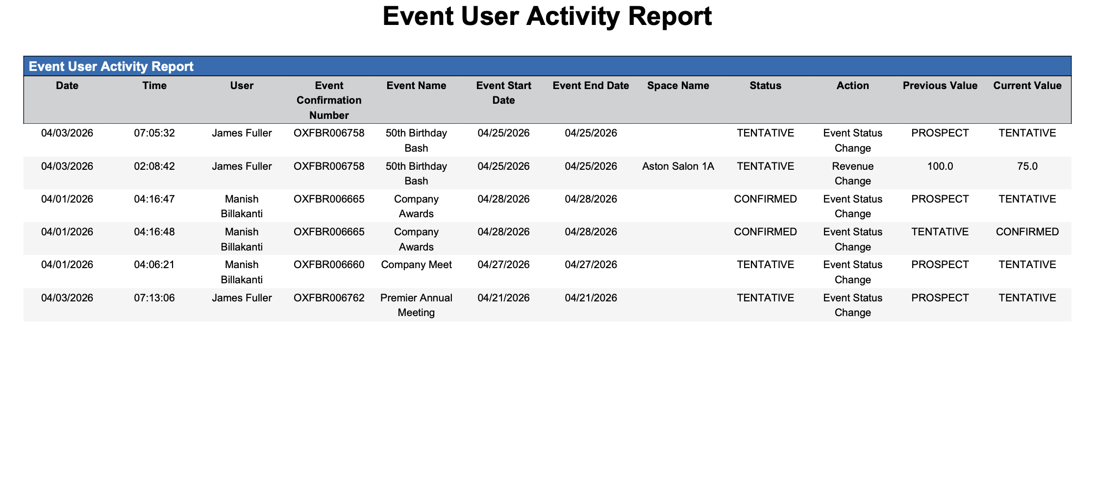 The User Activity Report provides total transparency into the complete lifecycle of an event by tracking every update or amendment made within the system. This report serves as a high-fidelity audit trail, capturing the exact date and time of every modification alongside the specific action takenβsuch as manual rate overrides or status changes