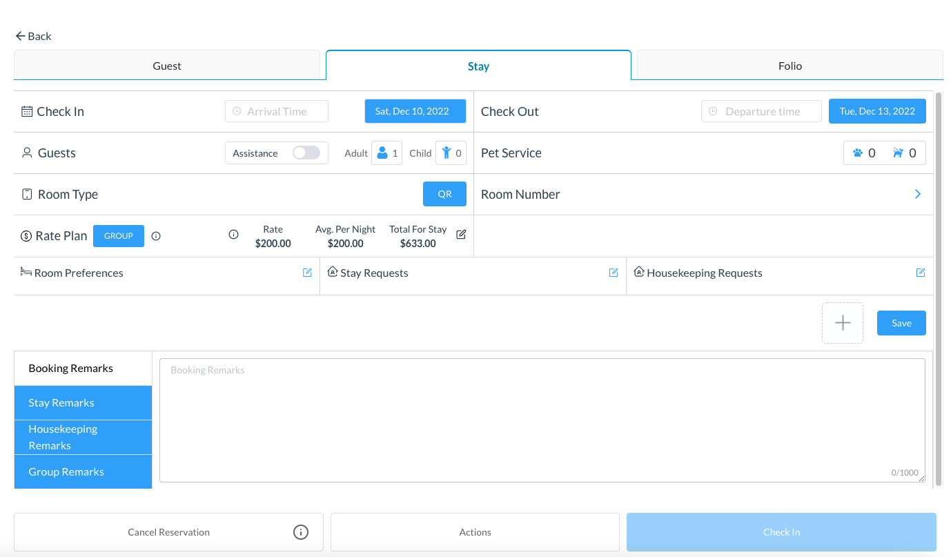 The reservation opens, with the Guest tab selected by default. Select the Stay tab. | ![]() |