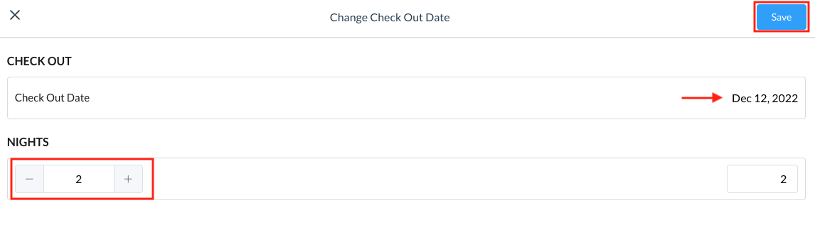 The Change [Check In / Check Out] Date popup activates, showing the date selected from the calendar widget. Select the applicable number of NIGHTS to be added or removed, using the addition and subtraction controls. Select Save. | ![]() |