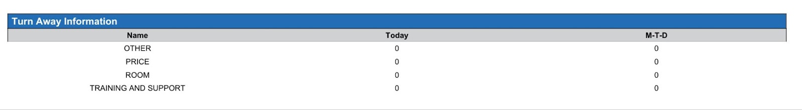 Turn Away section: Provides the total number of reservation turndowns and reason by turnaway date.