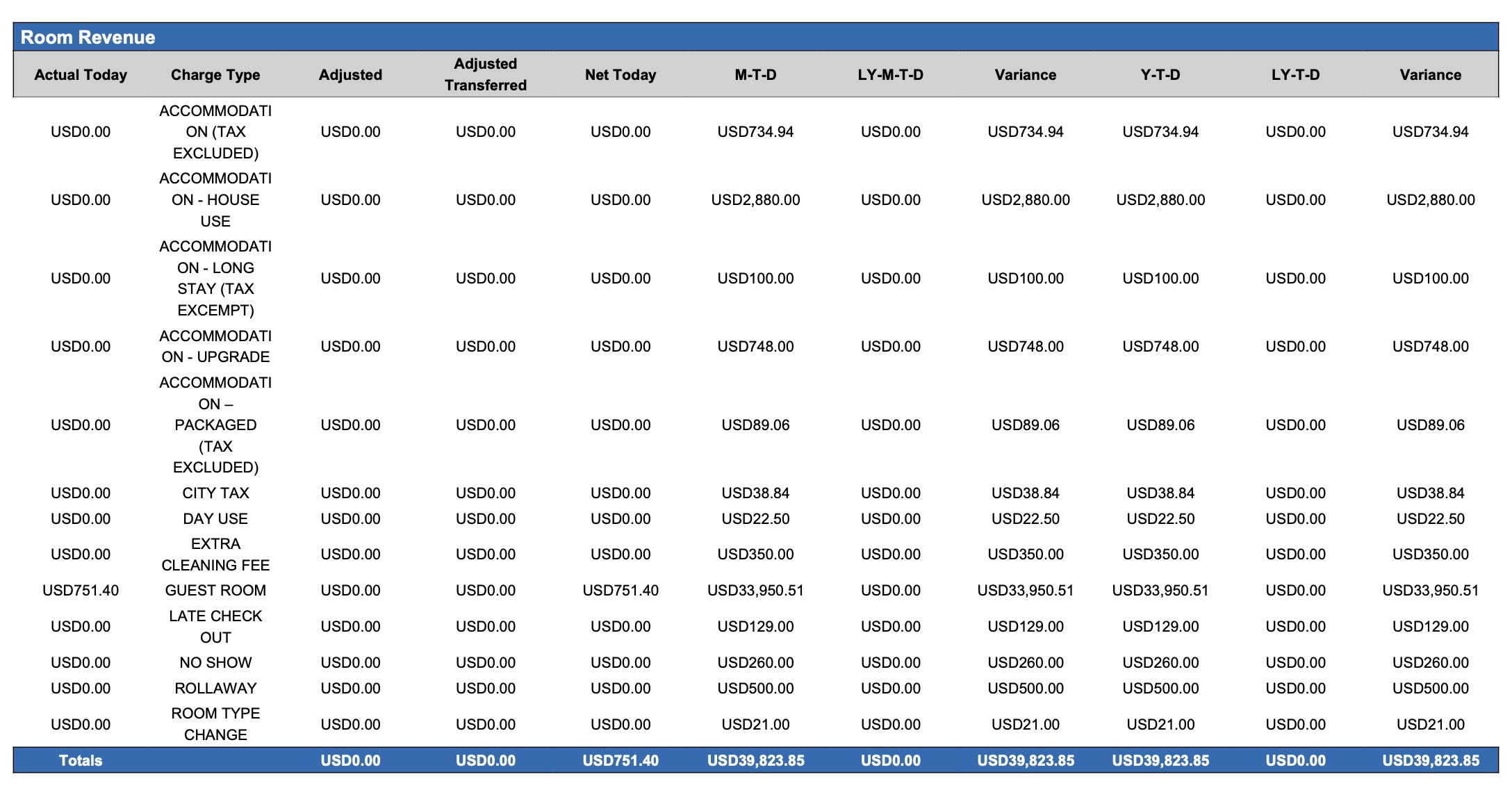 Room Revenue section: The total amount of income generated by charge type for the previous night's total numbers, compared to MTD, LY-MTD, the variance between the two, YTD, LY-YTD, and the variance between those two.