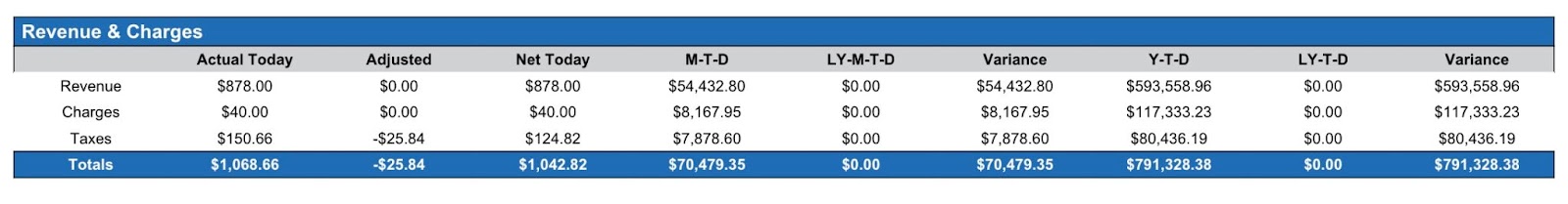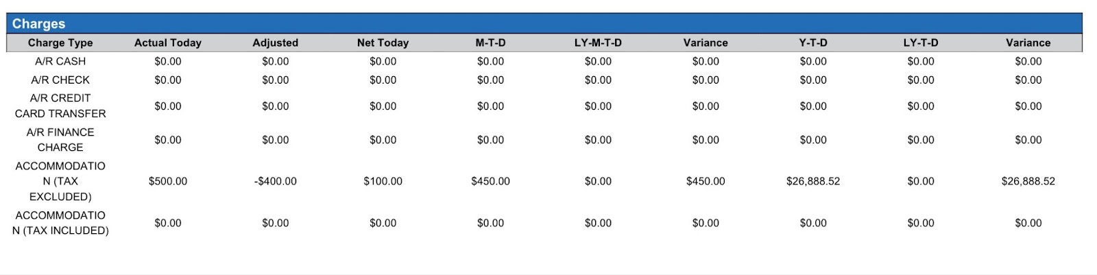 Charges section: Charges is a summary of all revenue associated with a charge type for the previous night's total numbers, compared to MTD, LY-MTD, the variance between the two, YTD, LY-YTD, and the variance between those two.