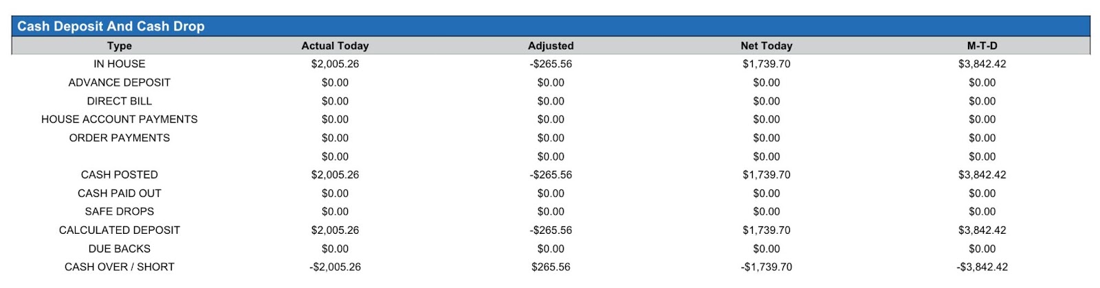 Cash Deposits and Cash Drop section: Cash Deposits and Cash Drop is a breakdown of the Actual Cash collected, Adjusted and the Net Today Cash Drop for the previous night's total numbers, compared to MTD. Shortages are indicated with (-), as shown in the example below.