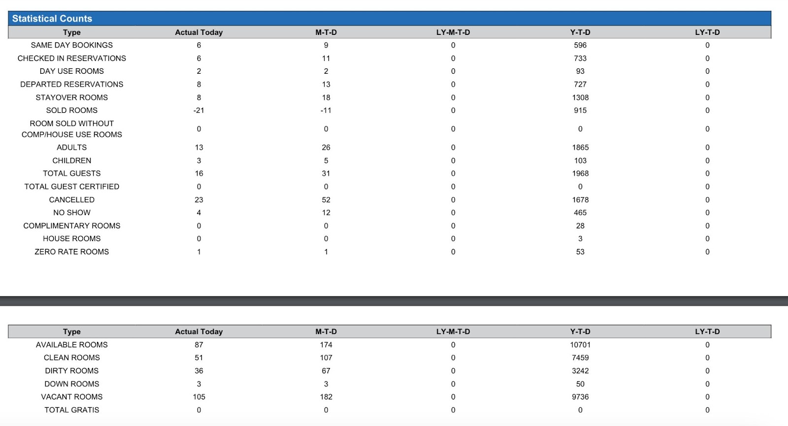Statistical Counts section: Statistical Counts provides a count broken down by statistical type (bookings, reservations, guests, rooms, etc.) for the previous night's total numbers, compared to MTD, LY-MTD, the variance between the two, YTD, LY-YTD, and the variance between those two.