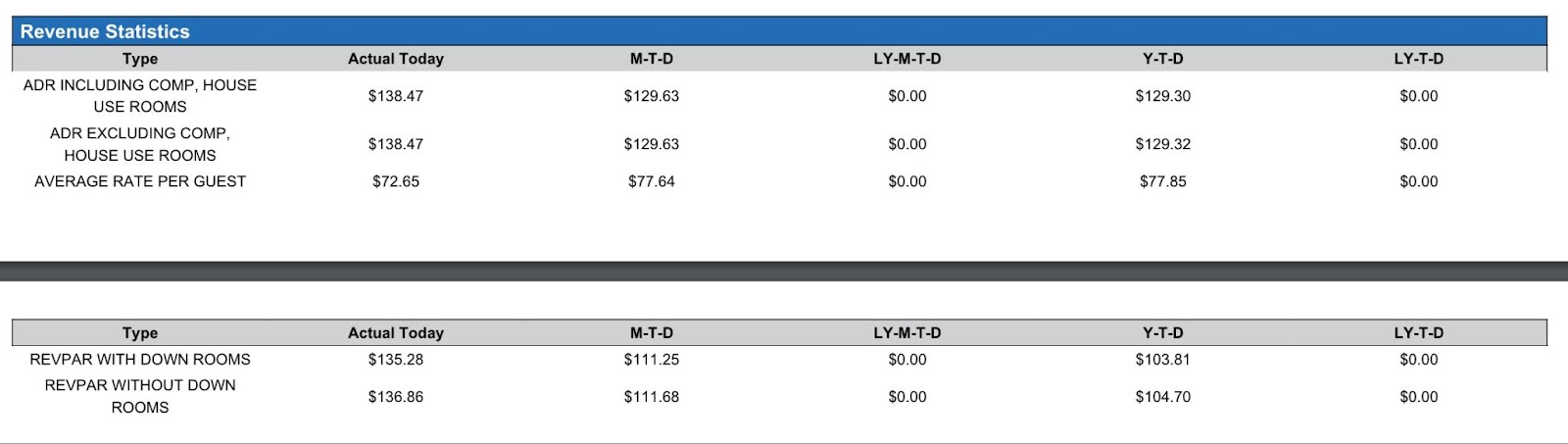 Revenue Statistics section: Revenue provides the Average Daily Rate (ADR) by various types (including or excluding including or excluding comp and House Use Rooms and Average Rate Per Guest for the previous night's total, compared to MTD, LY-MTD, the variance between the two, YTD, LY-YTD, and the variance between those two.