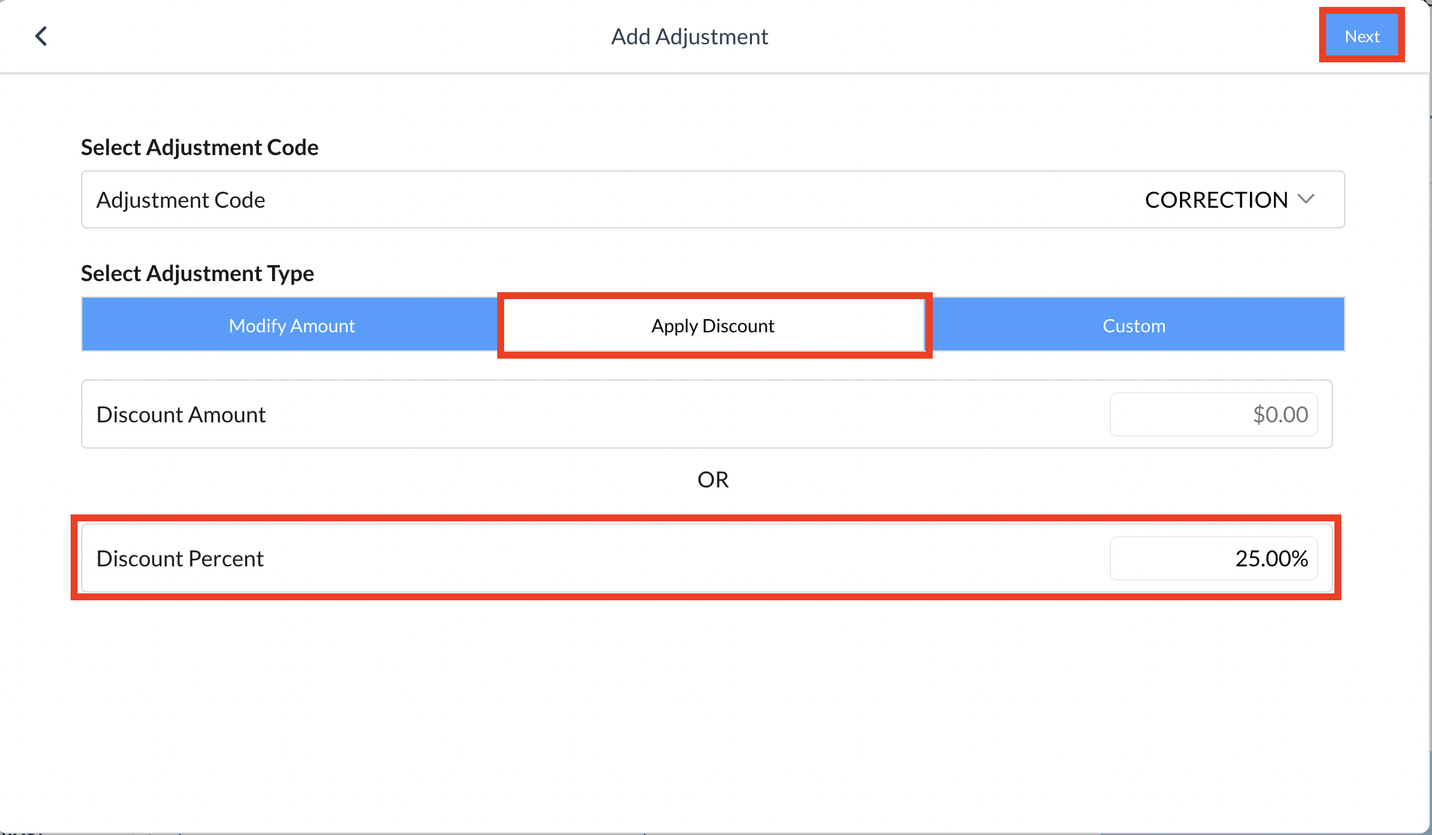 La fenêtre contextuelle « Ajouter un ajustement » s'affiche. Sélectionnez un code d'ajustement. Sélectionnez l'onglet « Modifier le montant », « Appliquer la remise » ou « Personnaliser » pour le type d'ajustement applicable, puis saisissez les détails de l'ajustement. Dans cet exemple, une remise de 25 % est appliquée au tarif « LOCATION DE LA CHAMBRE » dans l'onglet « Appliquer la remise ». Une fois les détails de l'ajustement complétés dans l'onglet concerné, sélectionnez « Suivant » pour continuer. | ![]() ![]() |