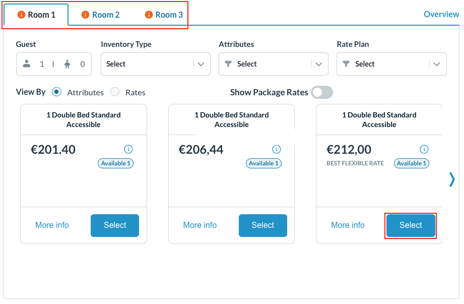 Chargement de la page Offres : le type de chambre et le forfait peuvent être sélectionnés pour chaque chambre. Chambre 1 : Saisissez le nombre de clients, puis utilisez les filtres pour explorer les options et sélectionner le type de chambre et le forfait. Répétez les étapes pour chaque onglet Chambre. | ![]() |