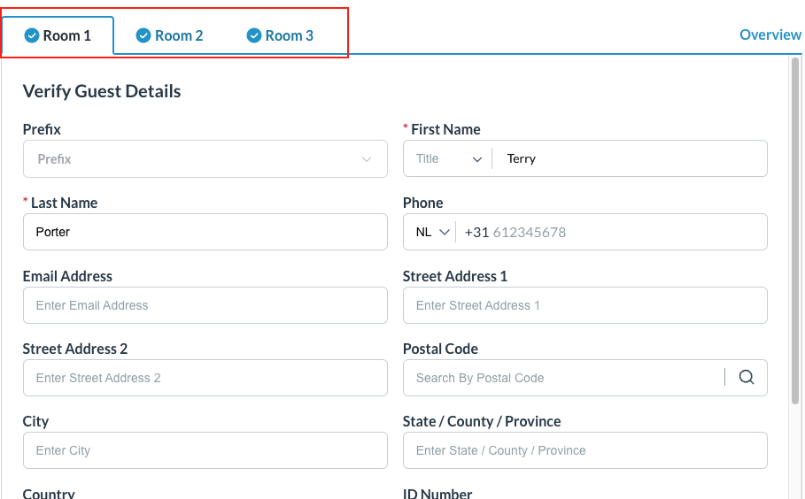 La page d'informations client se charge. Saisissez les données manquantes pour chaque chambre. Une fois terminé, cliquez sur Suivant. | ![]() |