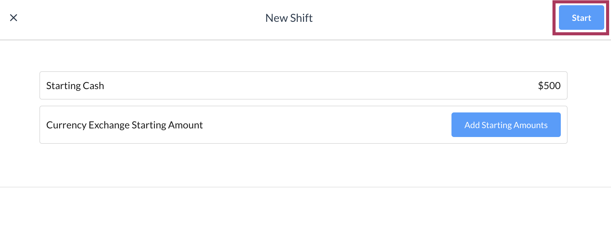 Une fenĂȘtre contextuelle New Shift est activĂ©e. Entrez Starting Cash et sĂ©lectionnez Start dans la fenĂȘtre contextuelle pour commencer le quart de travail. | ![]() |