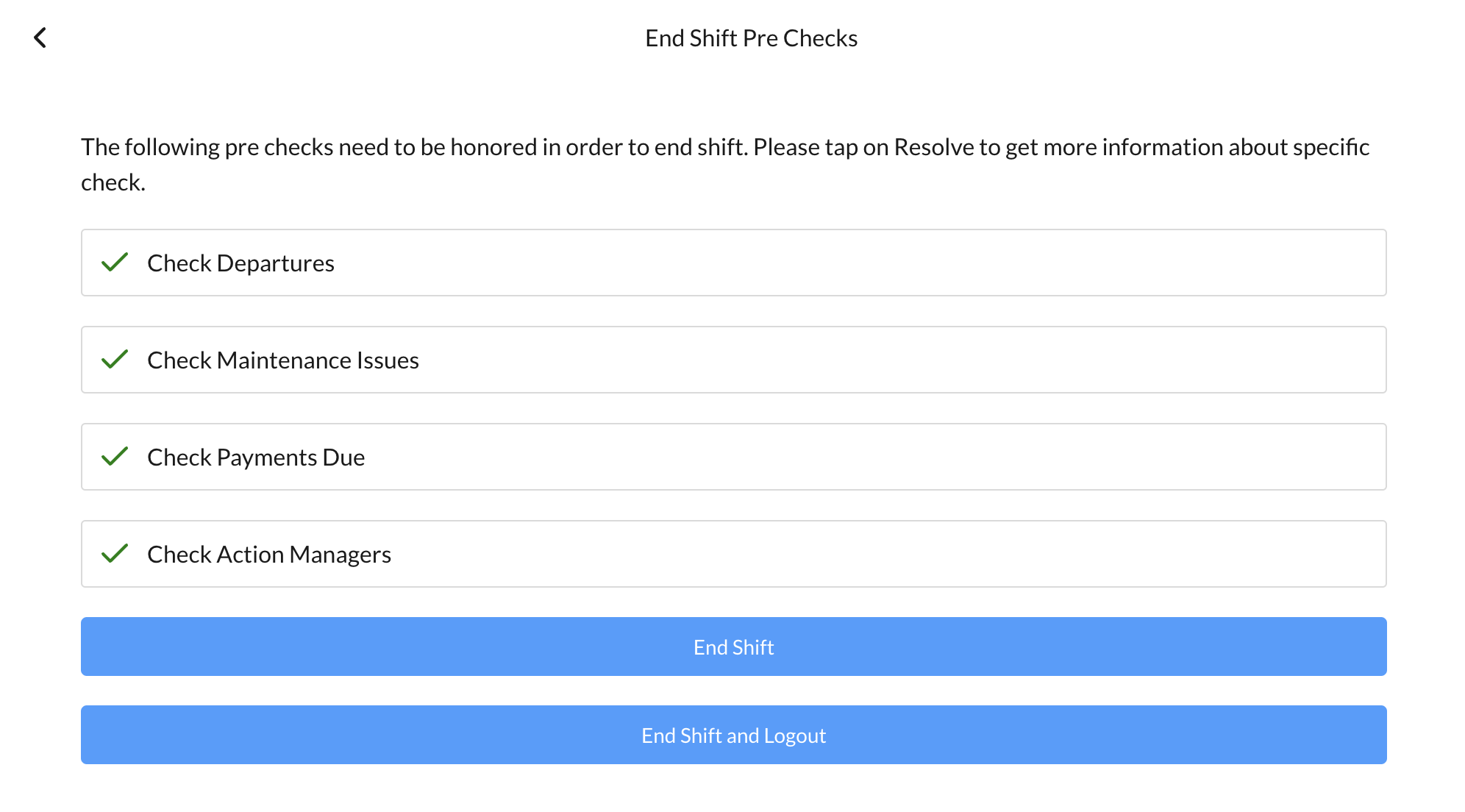 VĂ©rifiez que tous les contrĂŽles prĂ©alables sont terminĂ©s, puis sĂ©lectionnez Ă nouveau Terminer le service pour terminer le service. Notez que si le service n'est pas terminĂ© sur le systĂšme avant la dĂ©connexion de l'utilisateur, le total des paiements en espĂšces et par chĂšque effectuĂ©s pendant le service est automatiquement supprimĂ© et le service est clĂŽturĂ© lors de l'audit de nuit. Un nouveau service doit ĂȘtre dĂ©marrĂ© et un tiroir-caisse doit ĂȘtre attribuĂ© pour activer toutes les autres fonctionnalitĂ©s d'HotelKey. | ![]() |