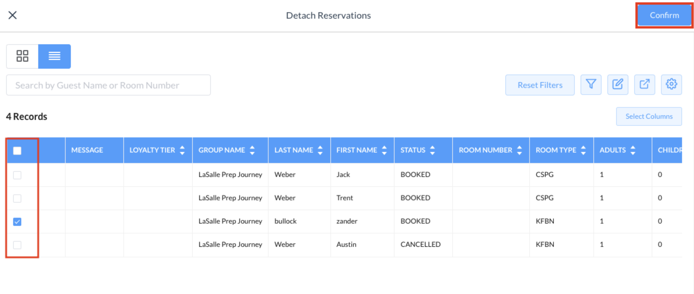L'écran « Détacher les réservations » s'affiche. Sélectionnez la ou les réservations à détacher. Cliquez sur « Confirmer ». | ![]() |