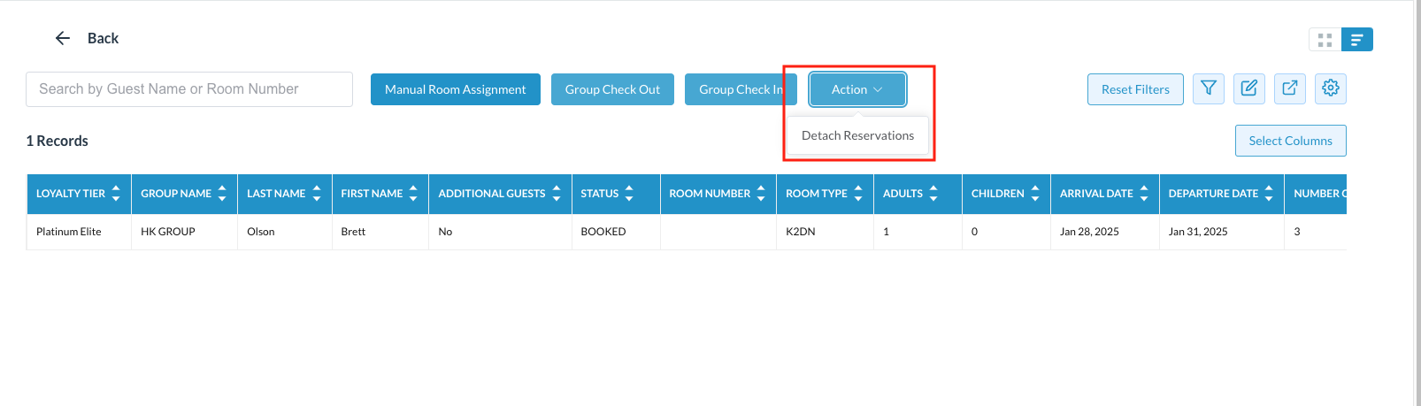 Les réservations sont répertoriées et à partir de cet écran, cliquez sur le bouton Actions et sélectionnez Détacher les réservations | ![]() |