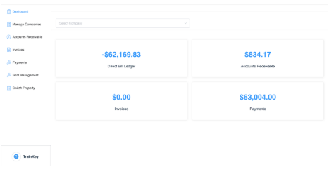 Le tableau de bord « Entreprises et facturation directe » fournit un aperçu de tous les comptes de facturation directe, y compris le solde total de tous les comptes. Pour afficher les détails d'une entreprise spécifique, utilisez le menu déroulant en haut et sélectionnez l'entreprise souhaitée. | ![]() |