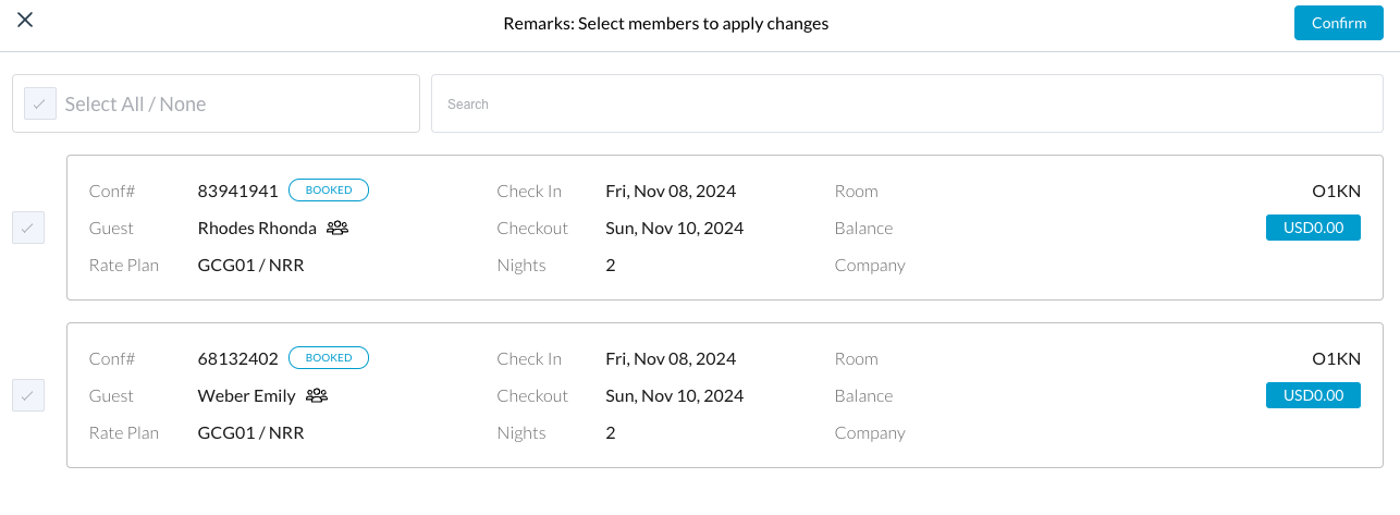 Enregistrer dans toutes les réservations : Remarques : L'écran « Sélectionner les membres pour appliquer les modifications » s'affiche avec toutes les réservations des membres sélectionnées. Vérifiez et cliquez sur « Confirmer » pour terminer la tâche. | ![]() |