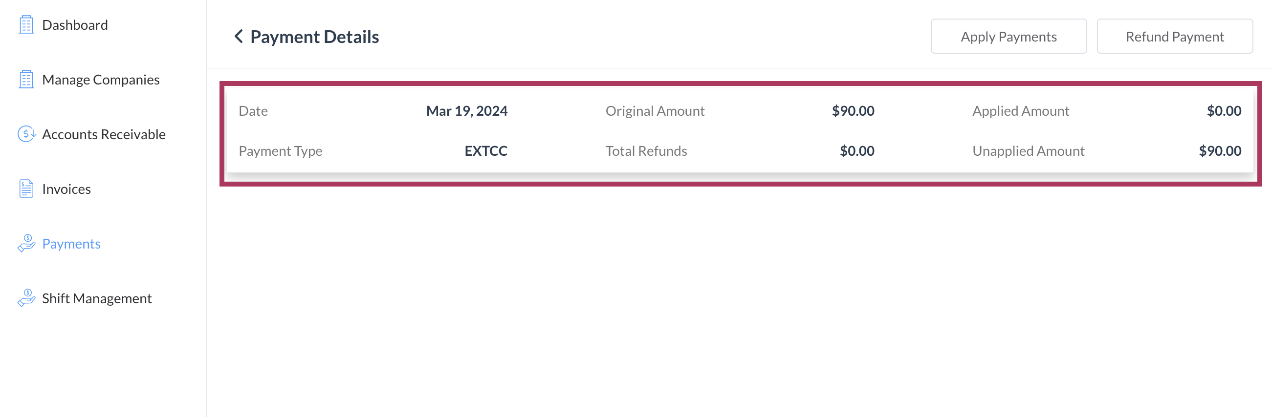 La page des détails de l'entreprise s'affiche. Sélectionnez le panneau « Paiements ». Dans le panneau « Paiements », sélectionnez la ligne à laquelle le remboursement sera appliqué. | ![]() |