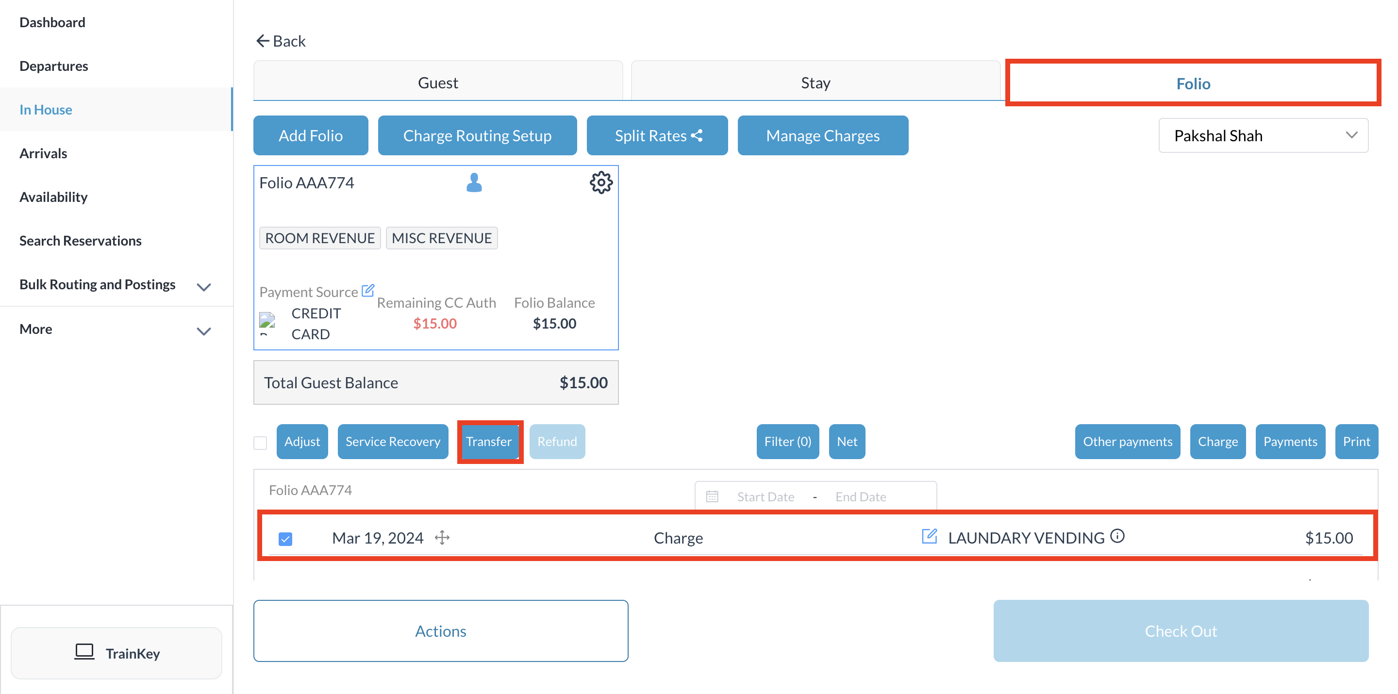 La page des détails de la réservation s'affiche et s'ouvre par défaut sur l'onglet Client. Sélectionnez l'onglet « Folio ». Dans cet onglet, cochez la case correspondant à chaque élément de frais à transférer. Sélectionnez « Transférer » pour continuer. | ![]() Page de détails de réservation - Onglet Folio |