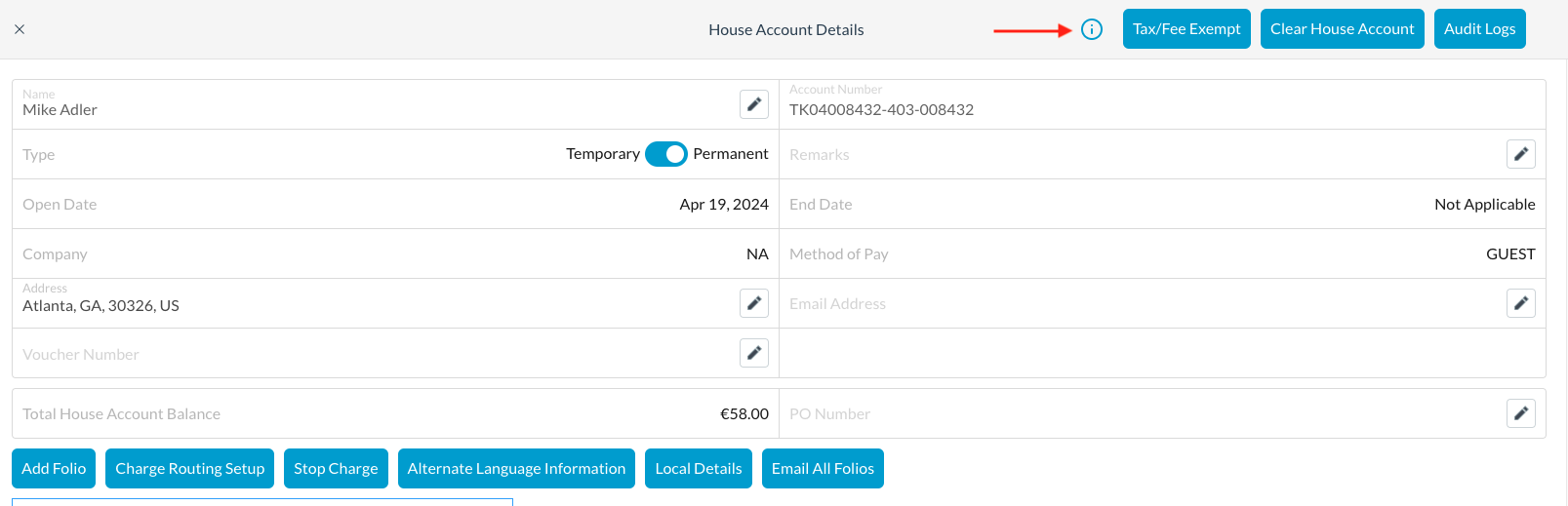 Sélectionnez le compte de votre maison parmi ceux proposés. Cliquez sur l'icÎne (i) en haut à droite de l'écran. | ![]() |
