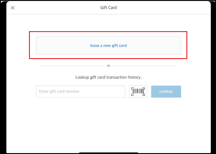 The Gift Card popup activates. Select Issue a new gift card. | ![]() Gift Card Popup |