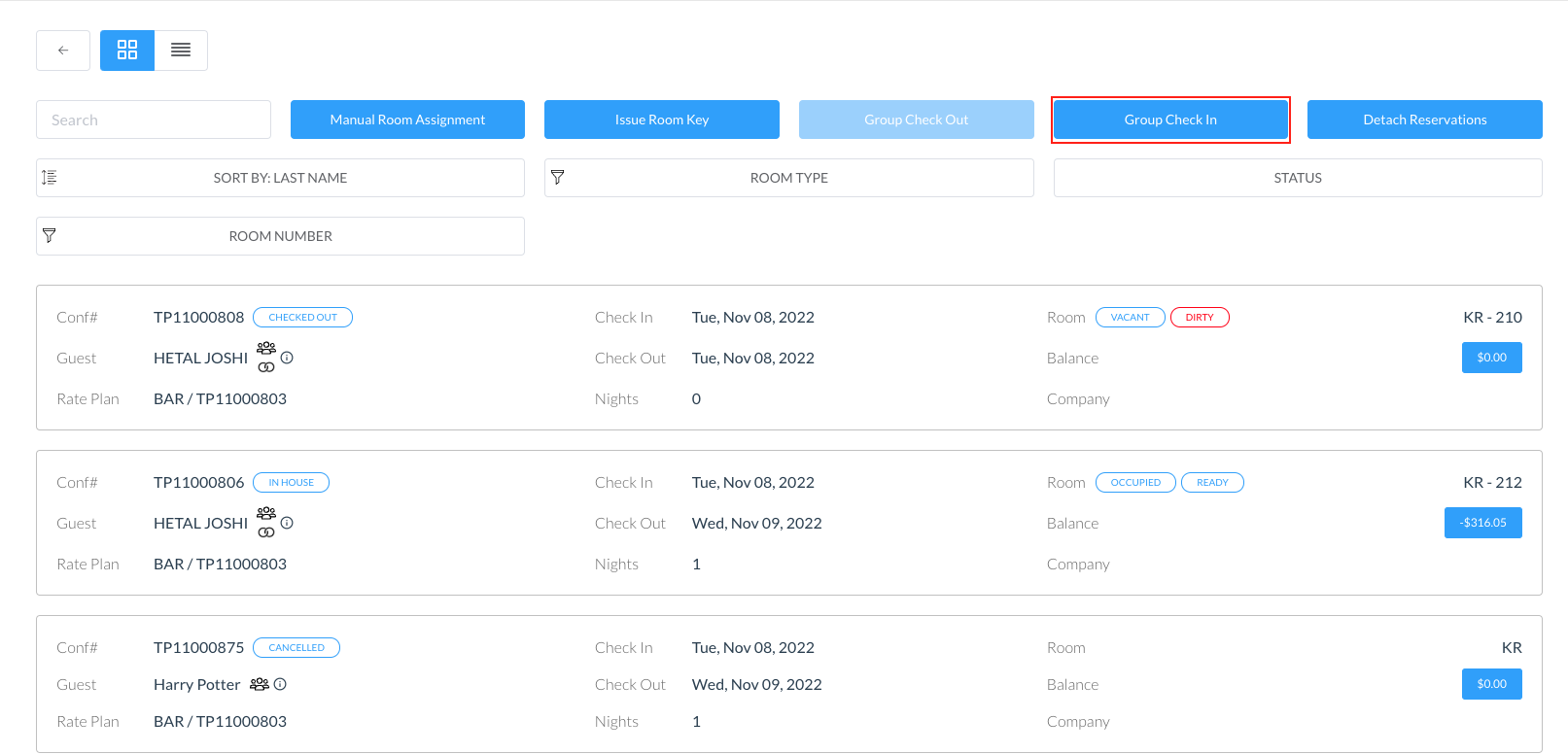Hinweis: Bevor Sie die Gruppe einchecken, vergewissern Sie sich, dass allen oder einigen wenigen Zimmern, die Sie einchecken möchten, Zimmer zugewiesen wurden. Wenn nicht, klicken Sie auf die Schaltfläche Manuelle Raumzuweisung, um die Aufgabe auszuführen. Klicken Sie auf den Gruppen-Check-In | ![]() |