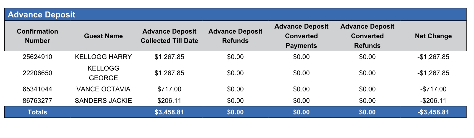 Advance Deposit Refunds | Shows advance deposit amounts refunded today on this reservation | YES | =sum(advance deposit refunds) |