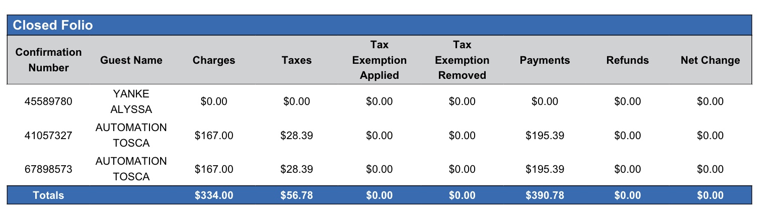 Tax Exemption Applied | Shows the amount of tax exemption posted today on this reservation | YES | =sum(tax exemption applied) |