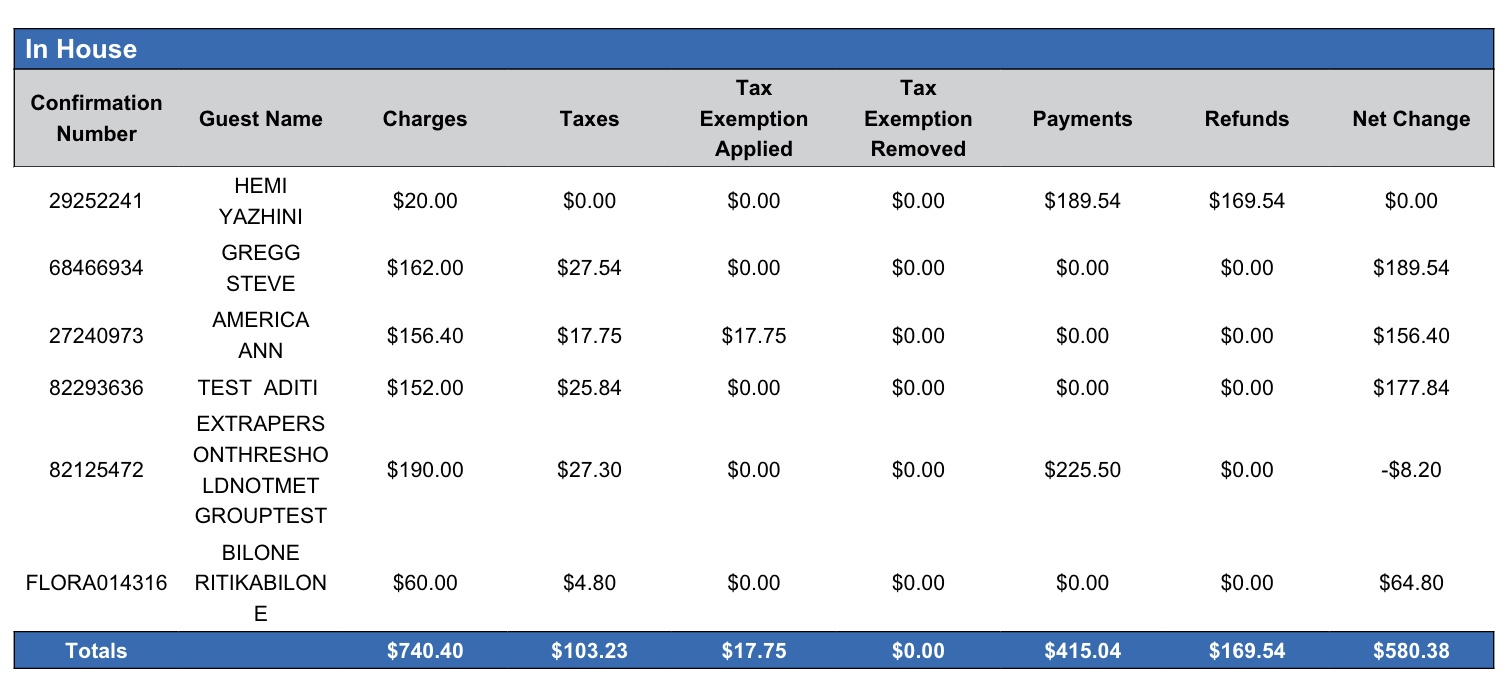 In-House section: Provides charges, taxes and payments to the guest in-house for the period, and the net change.