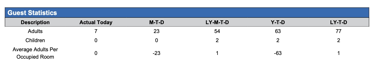 Guest Statistics section: Provides detailed information on guest statistics compared to MTD, LY-MTD, the YTD and LY-YTD.