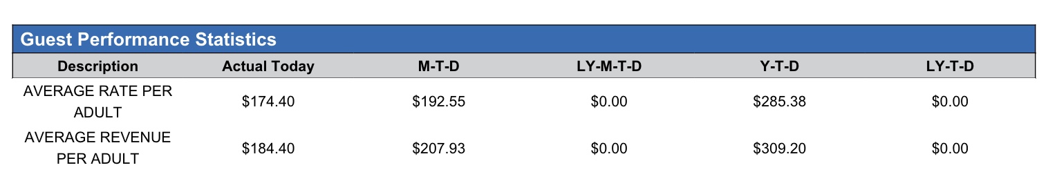 Guest Performance Statistics Section: Provides detailed information on guest performance statistics compared to MTD, LY-MTD, the YTD and LY-YTD.