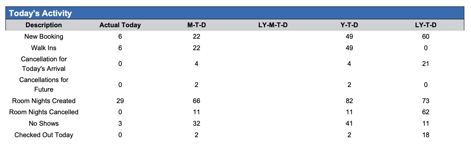 Today’s Activity section: Provides detailed information on today’s reservation transaction activity compared to MTD, LY-MTD, the YTD and LY-YTD.