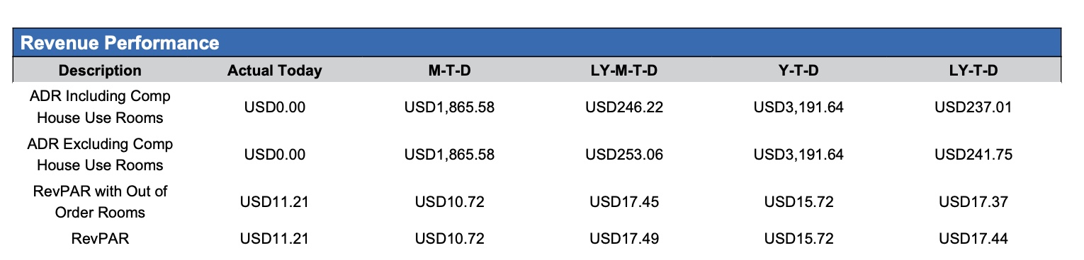 Revenue Performance section: Provides detailed information on Average Daily Rate & Revenue Per Available Rooms compared to MTD, LY-MTD, the YTD and LY-YTD.