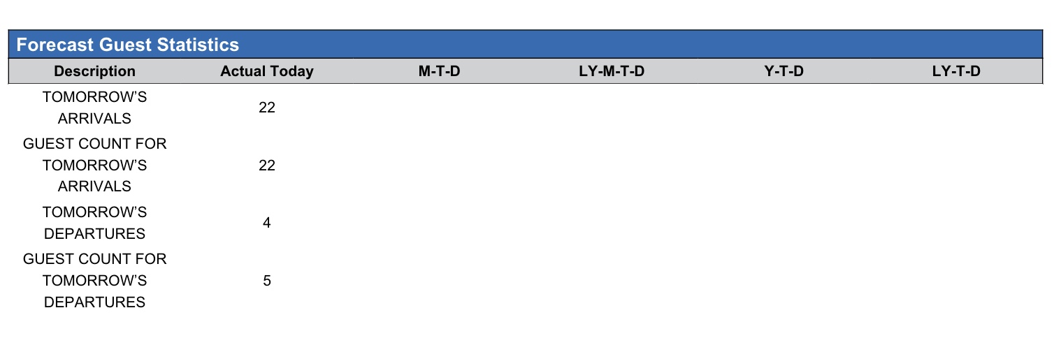 Guest Count for Tomorrow’s Departures: count of guests scheduled to depart the next day.