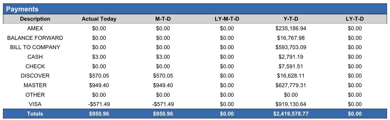 Payments section: Provides detailed information on payment types production compared to MTD, LY-MTD, the YTD and LY-YTD.