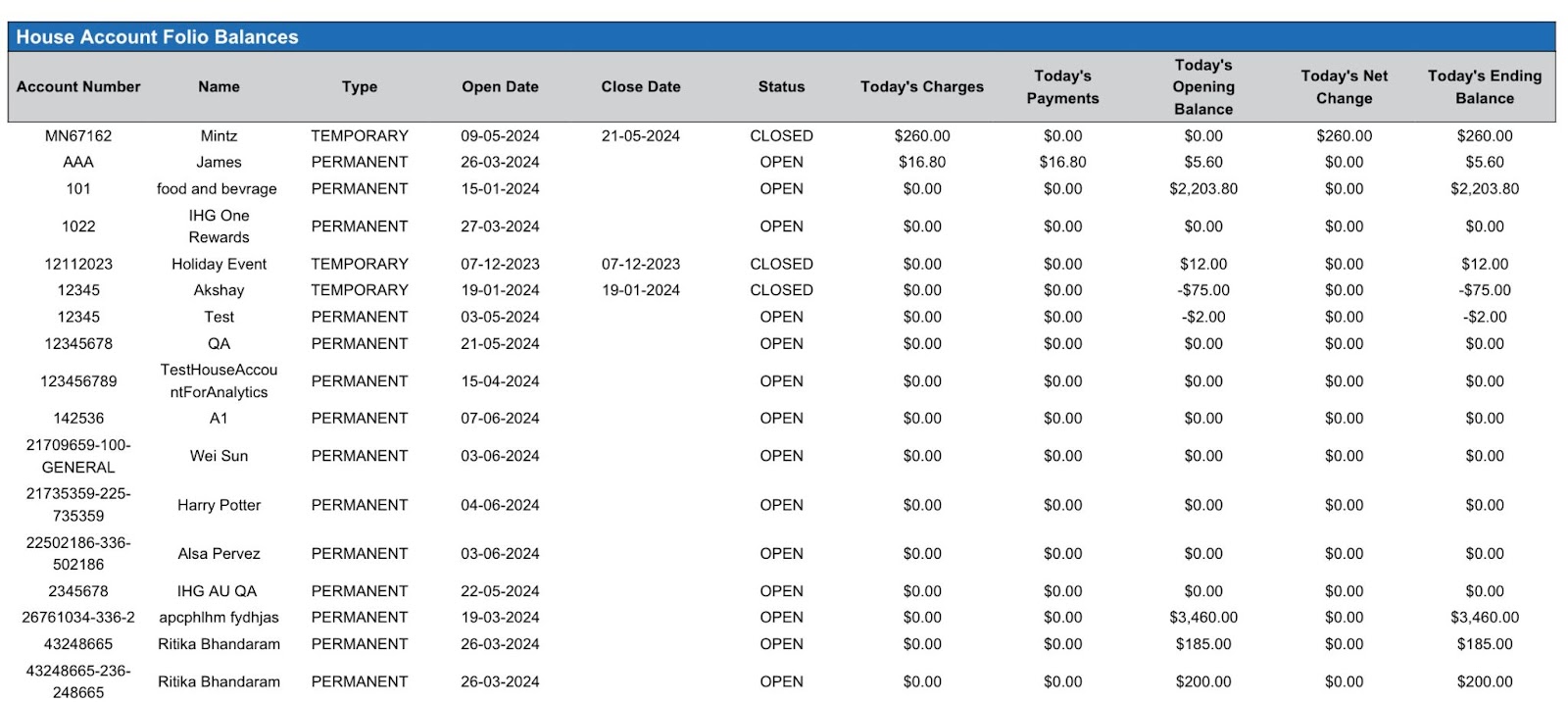 Today’s Opening Balance | Shows opening balance on today’s house account folio *Positive number indicates there is a positive balance due *Negative number indicates there is a negative balance due | YES | Not Applicable |