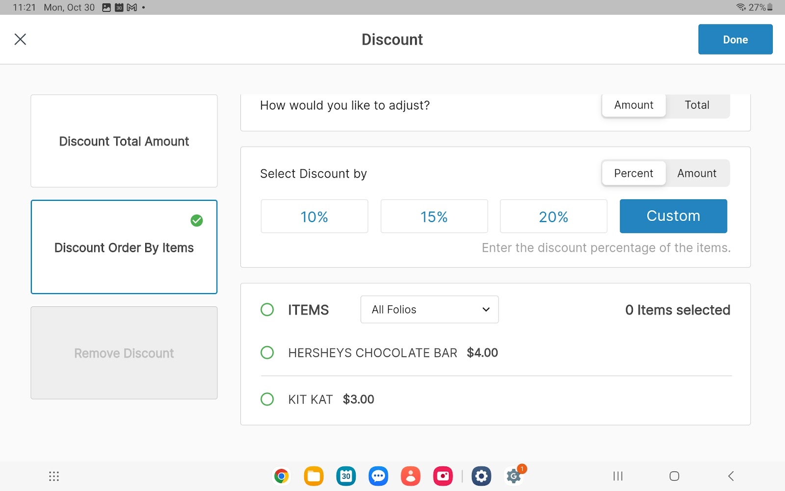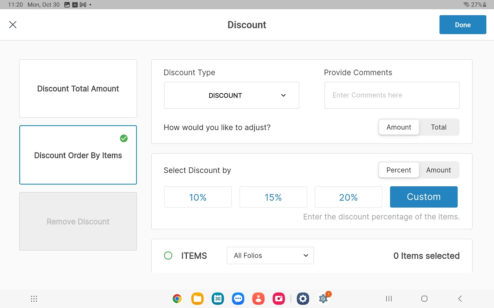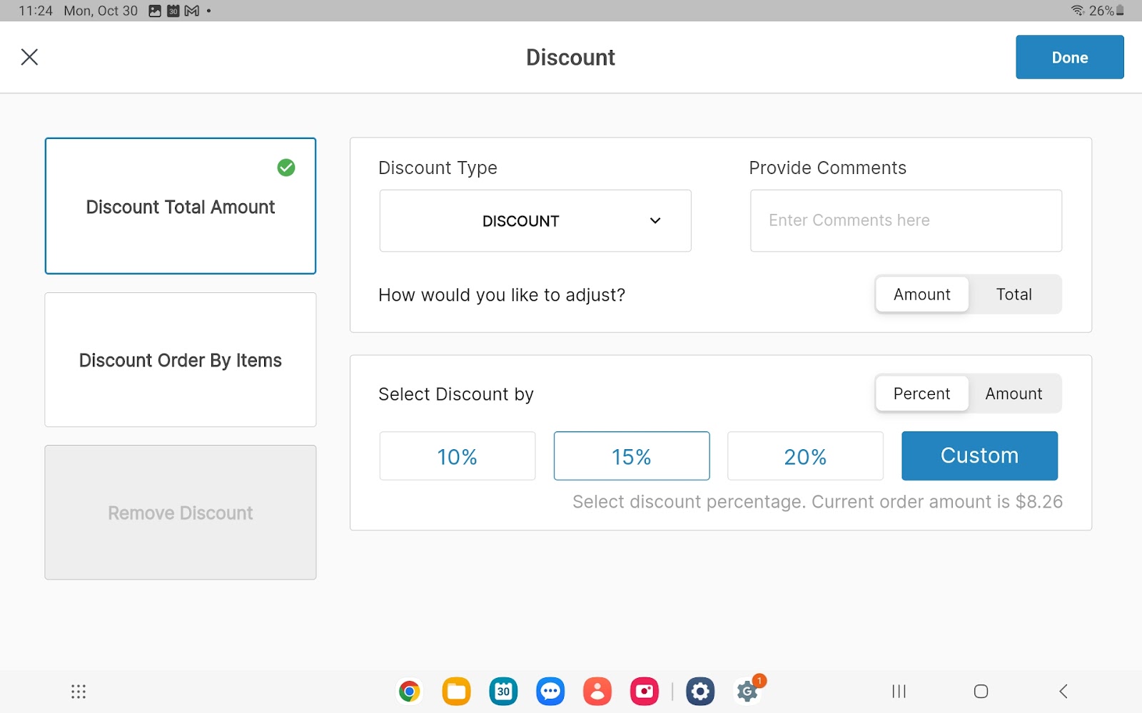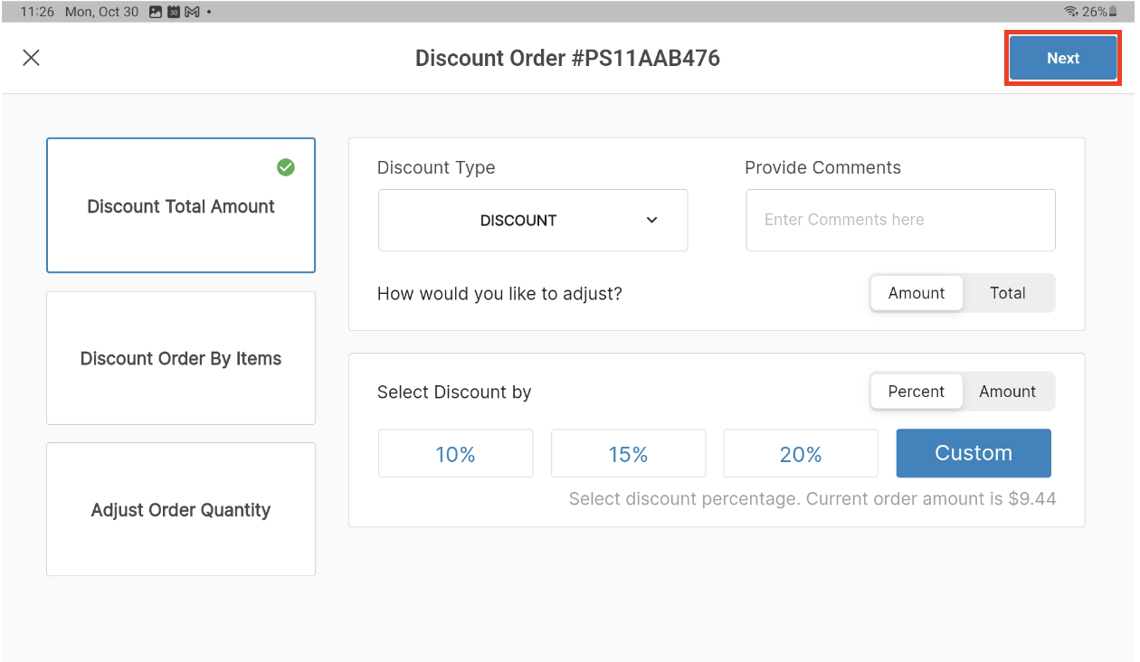 For the first option: You can discount by one of the following two options: How would you like to adjust? If you select amount (default) - proceed to the Select Discount by section, select/enter a Percent or select Amount to enter a dollar amount If you select total - enter the new order total including or excluding tax When all discounts are added and details are complete, select Done at the upper right corner of the popup. |