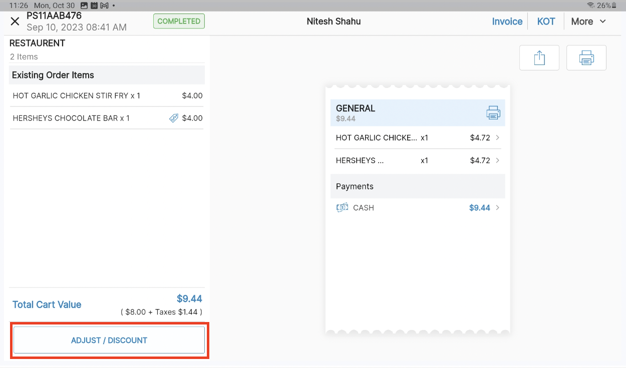 On a Completed Order Once you have navigated to the completed order, select the Adjust/Discount (to adjust an order once completed is permission based and may be required to be done by a manager) button and follow above steps to make any modification. Once modifications are made, select Next