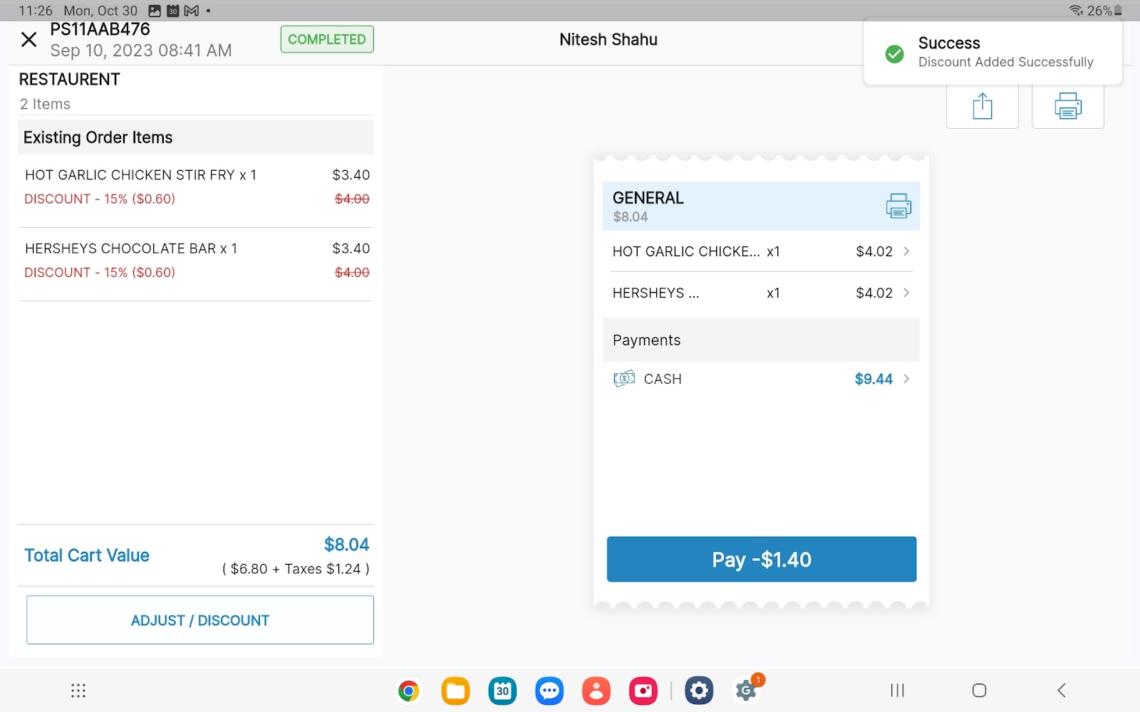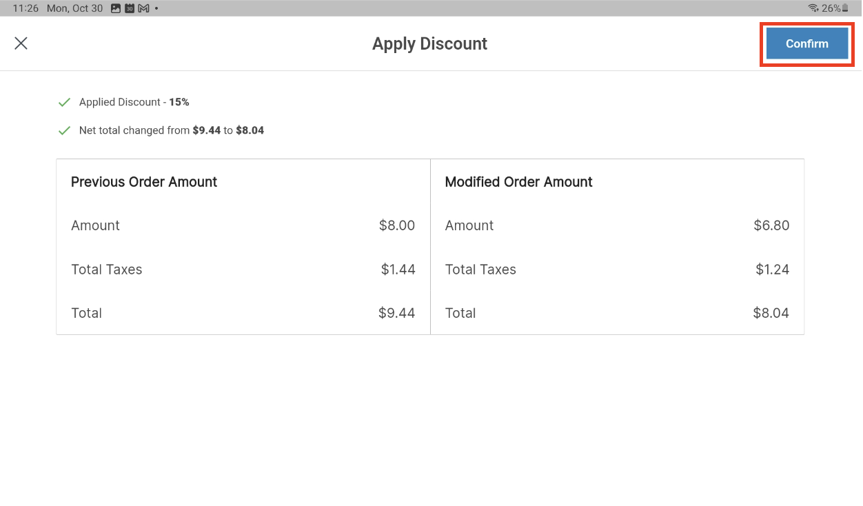 The APPLY DISCOUNT popup loads, displaying details of discounts to be applied. Review details, then select Confirm to apply the discount(s). If details are incorrect, use the (x) at the upper left to go back and make changes. You then need to address any discrepancies on the bill to ensure the order is balanced. In the example provide you would need to process the refund of a $1.40. |