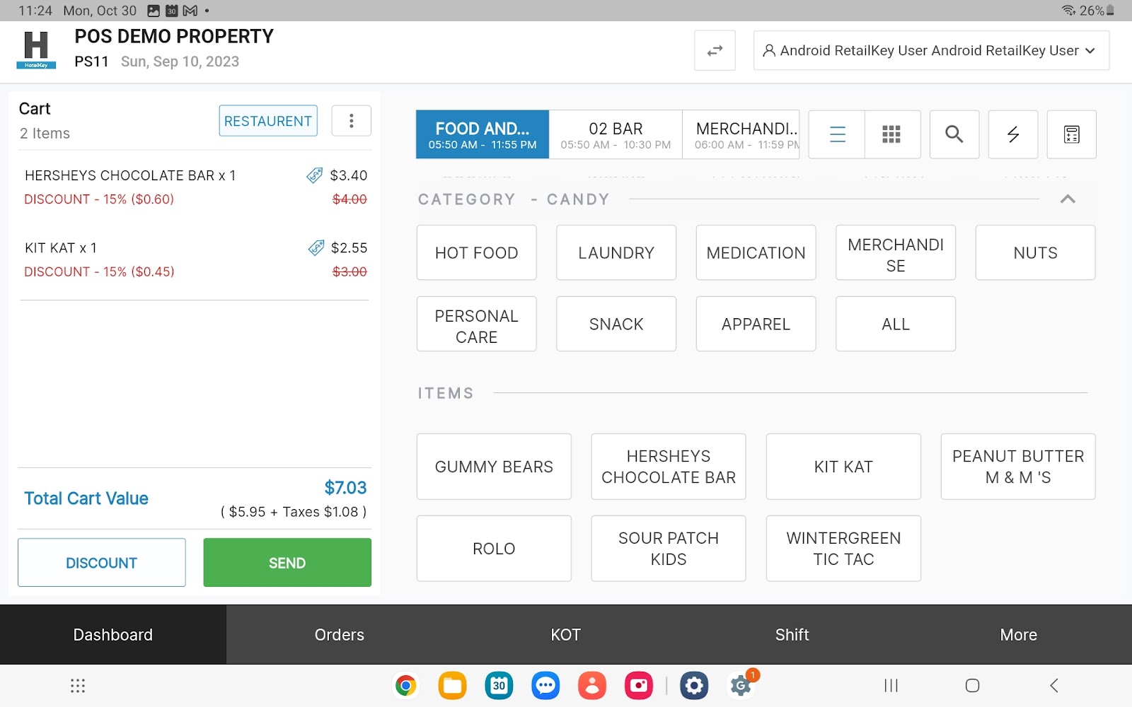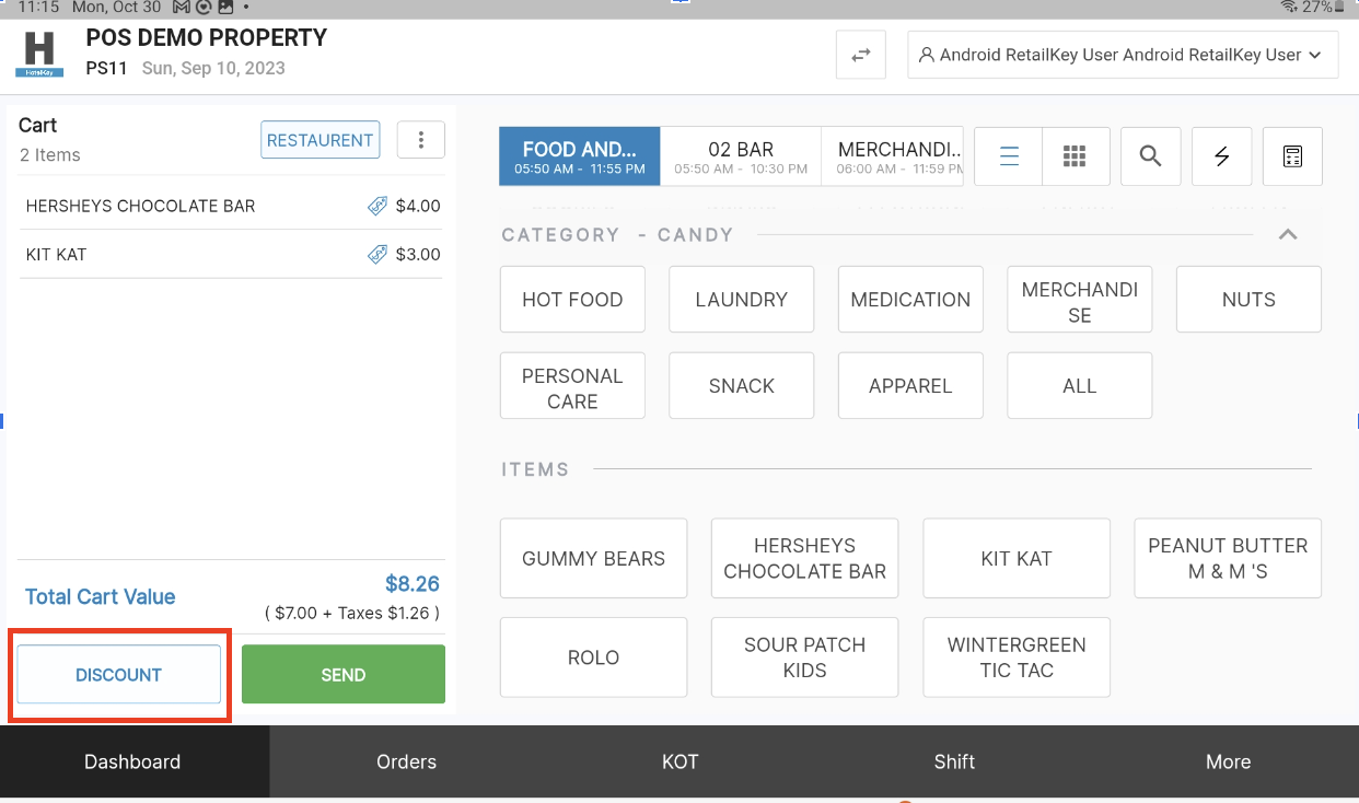 To apply a discount to items in the cart, on the Dashboard screen, select the discount button