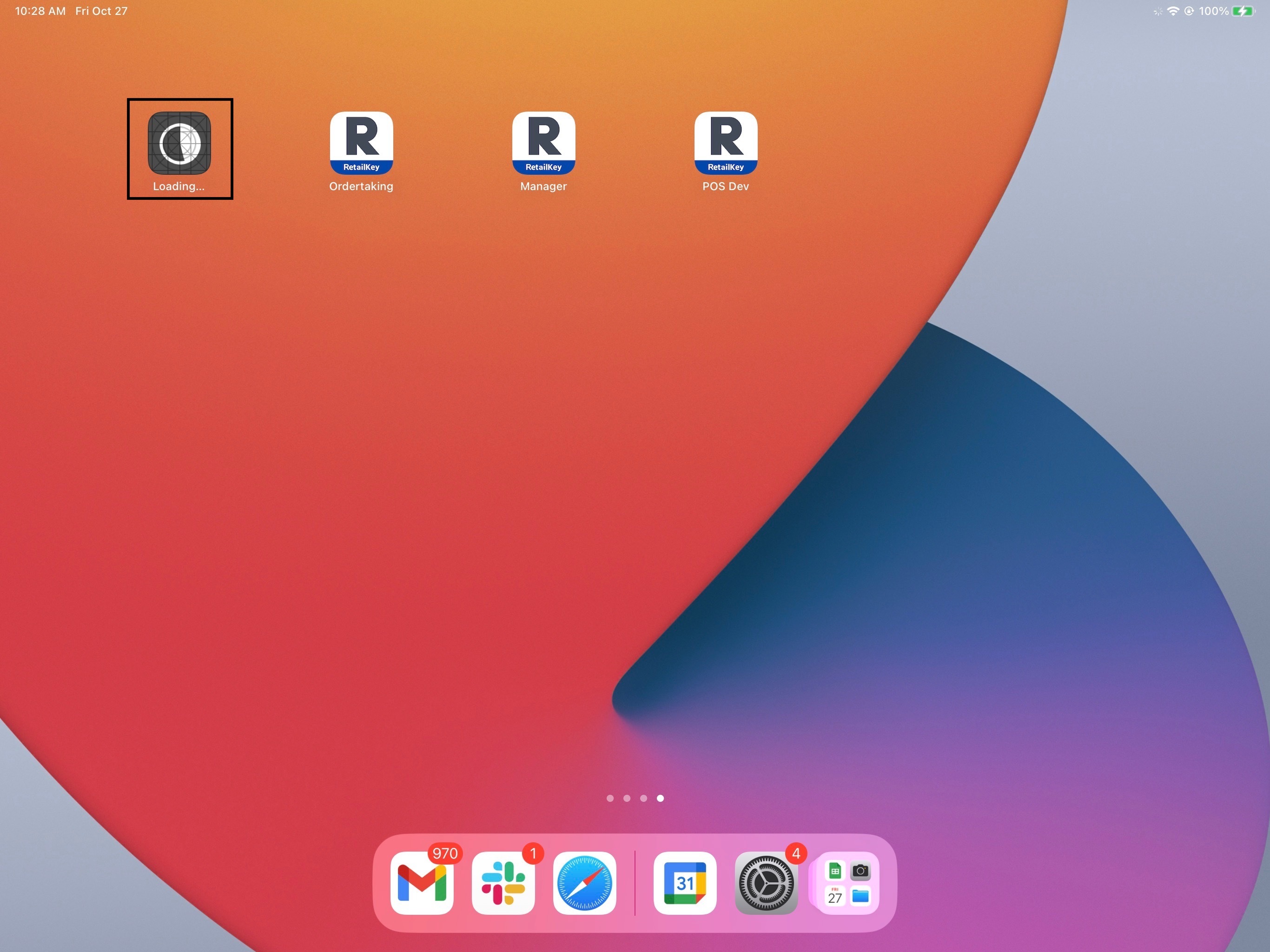 Return to the home page of the iPad, where an installation progress wheel displays until installation is complete. | ![]() RetailKey POS Installation Progress Wheel |