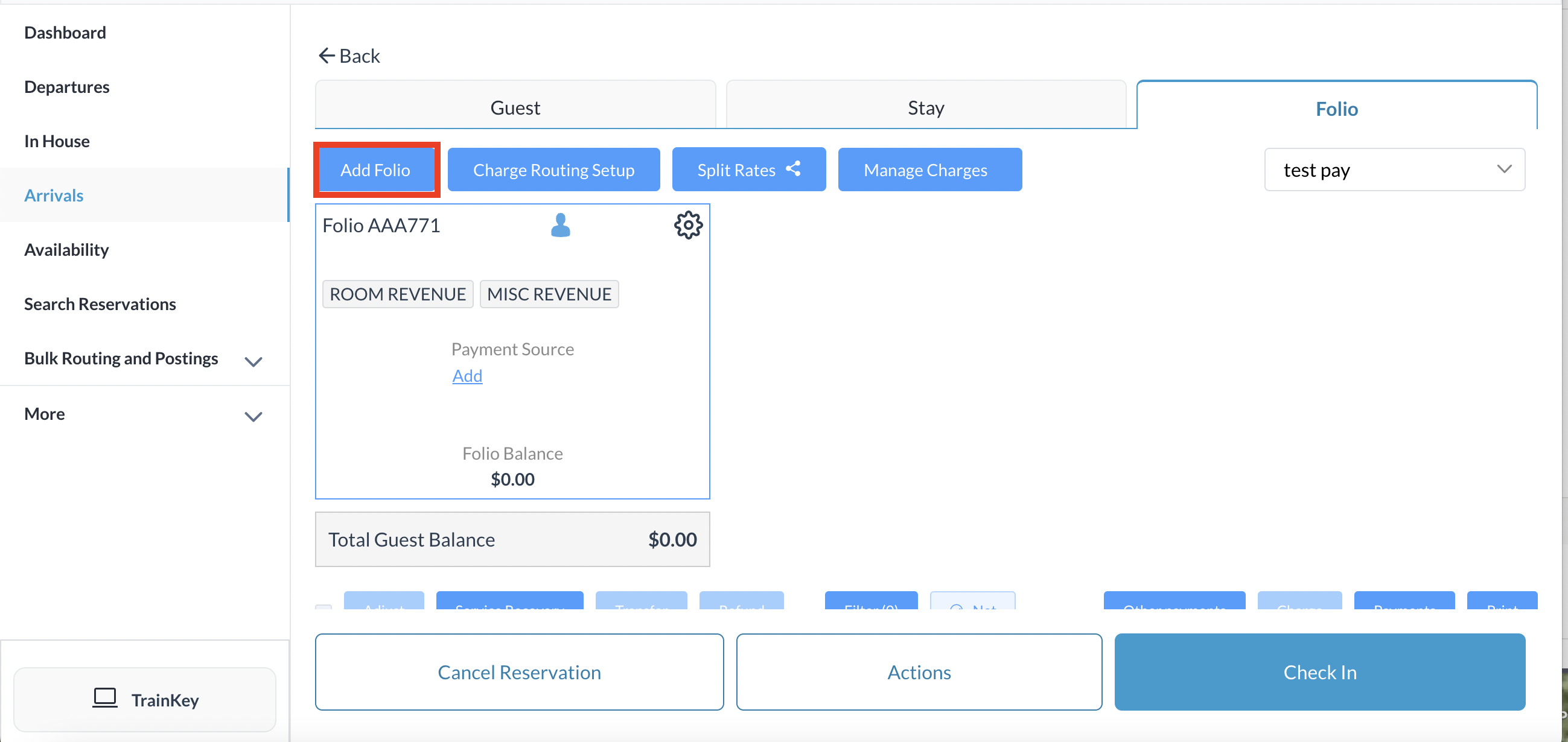 Viene caricata la pagina dei dettagli della prenotazione, aperta per impostazione predefinita alla scheda Ospite. Selezionare la scheda Folio | ![]() |
