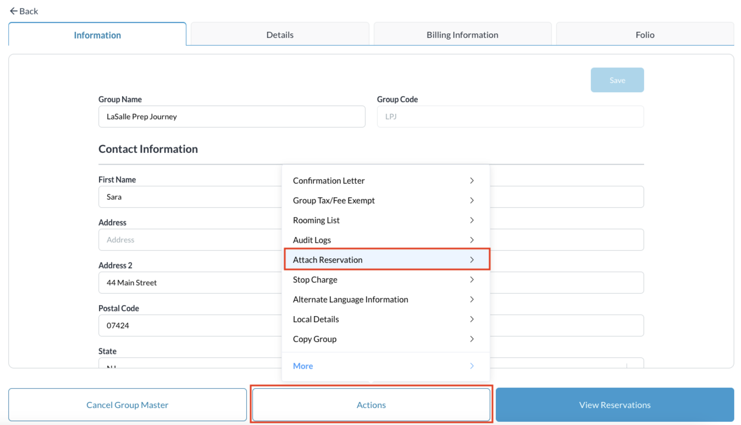 Una volta selezionata, la scheda Informazioni si apre per impostazione predefinita. Fai clic sulla scheda Azioni e fai clic su Allega prenotazione | ![]() |