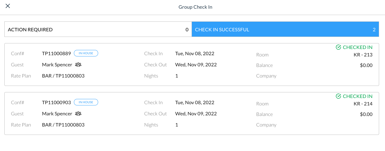 Si apre la schermata Group Check In Seleziona le prenotazioni per cui è necessario effettuare il check-in utilizzando la casella di controllo Clicca su Procedi con il check-in | ![]() |
