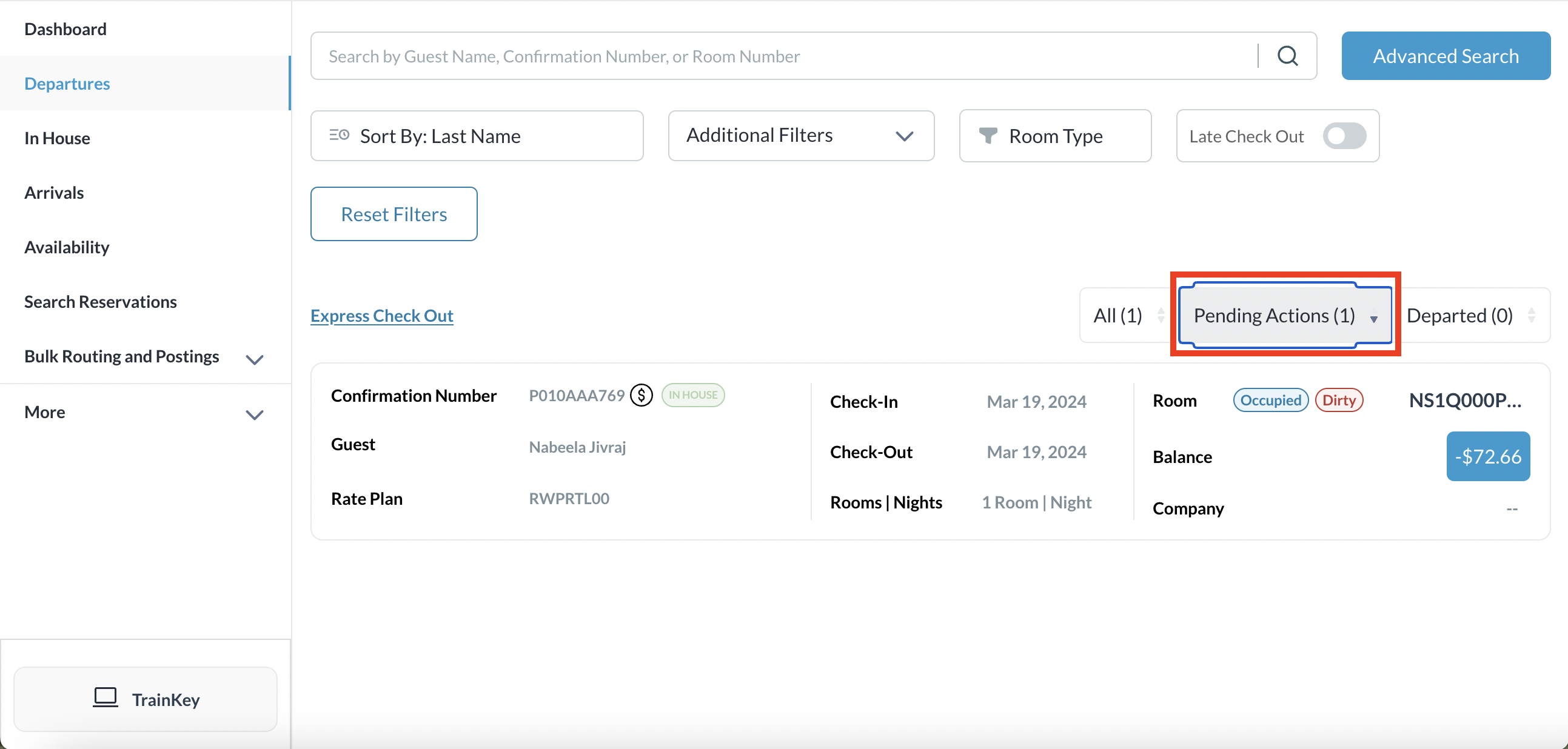 Tutte le partenze sono elencate per impostazione predefinita. È possibile applicare filtri per restringere la visualizzazione, selezionando In attesa o Partiti. (Figura 1) In questo esempio, applicare il filtro In attesa e individuare la prenotazione applicabile tra quelle elencate e tra quelle elencate e fare clic su di essa. (Figura 2) | ![]() Figure 1: All Departures list ![]() Figure2: Pending Departures listed by filter |