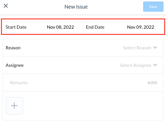 Nel campo Assegnatario, selezionare il tecnico di manutenzione assegnato. A scelta, aggiungere commenti nel campo di testo fornito. In alternativa, selezionare l'icona con il segno più per caricare un'immagine del problema. Selezionare Salva per creare il nuovo problema | ![]() |