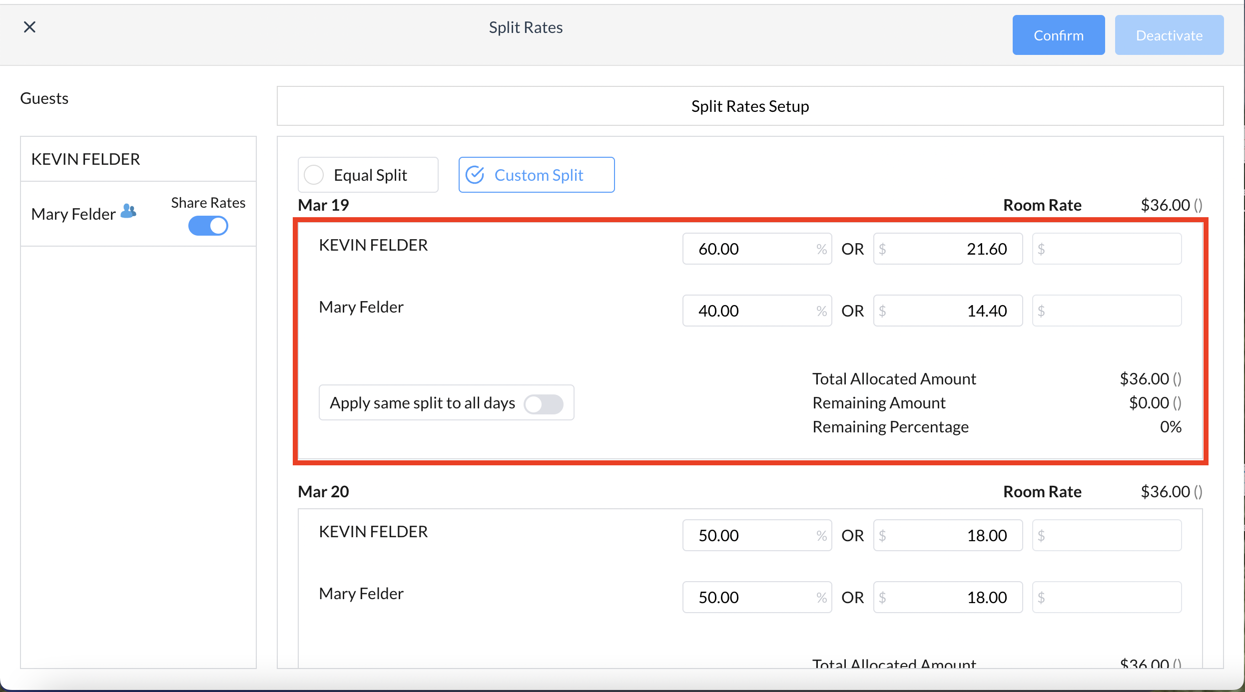 カスタム分割を選択 - レートの分割画面が表示されます。 パーセンテージで分割する 右の例では、1人目のゲストに客室料金の60%が割り当てられています - 1人目の割合が入力されると、割り当て合計額と残りの金額が表示されます - レートの分割を完了させるために残りのゲストを40%に設定します。 必要に応じて、すべての日に同じ分割内容を適用するか、手動で残りの滞在の分割設定をして完了します。 | ![]() ![]() |