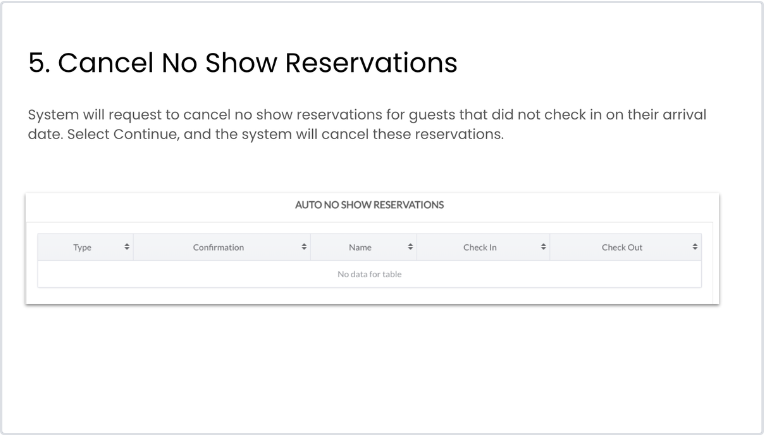 ナイトオーディットが実行されると、到着予定のまま残っている予約は以下のシステムプロセスによって自動的に「ノーショー」または「キャンセル済み」に分類されます。