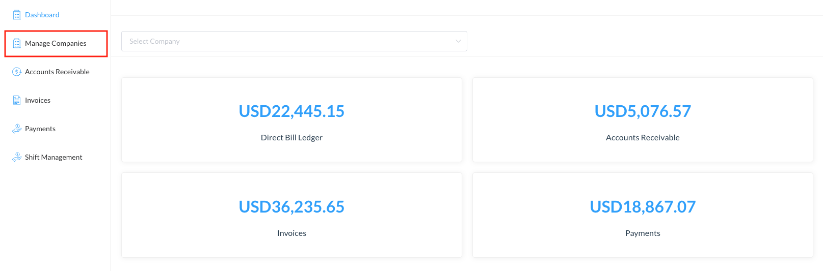 会社と売掛請求のダッシュボードが表示されたら、会社の管理を選択します。 | ![]() |