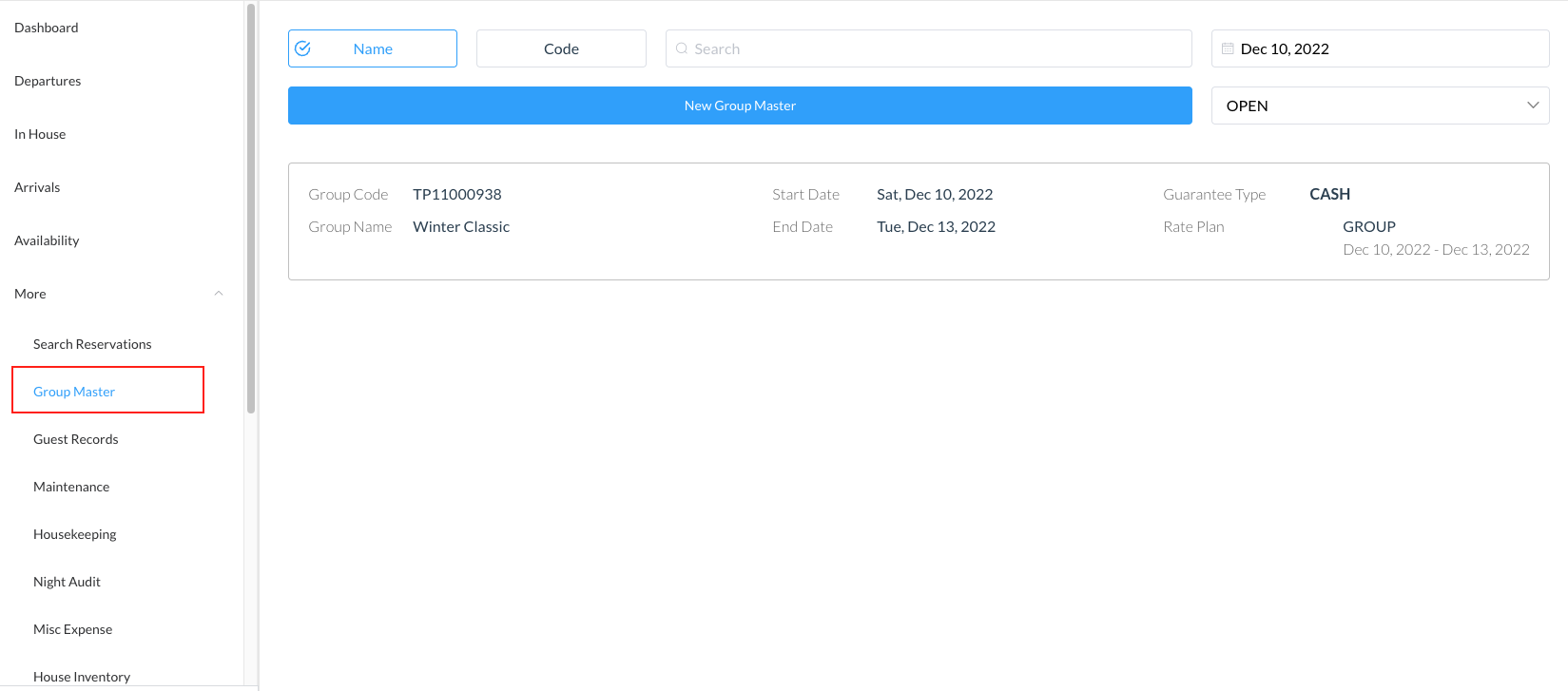メニューからグループ マスターを選択する。グループマスターを名前、コード、日付、またはステータスで検索し、開く。 | ![]() |