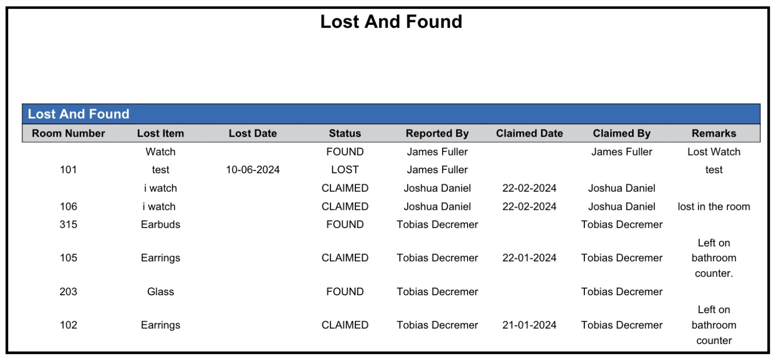 Report Description: The Lost and Found Report provides a current list of lost and found items, including details such as room number, lost item description, date the item was lost, status, person who reported the item, date the item was claimed, person who claimed the item, and any remarks. This report facilitates the management of lost and found items by providing a comprehensive overview of items that have been reported lost and their current status.